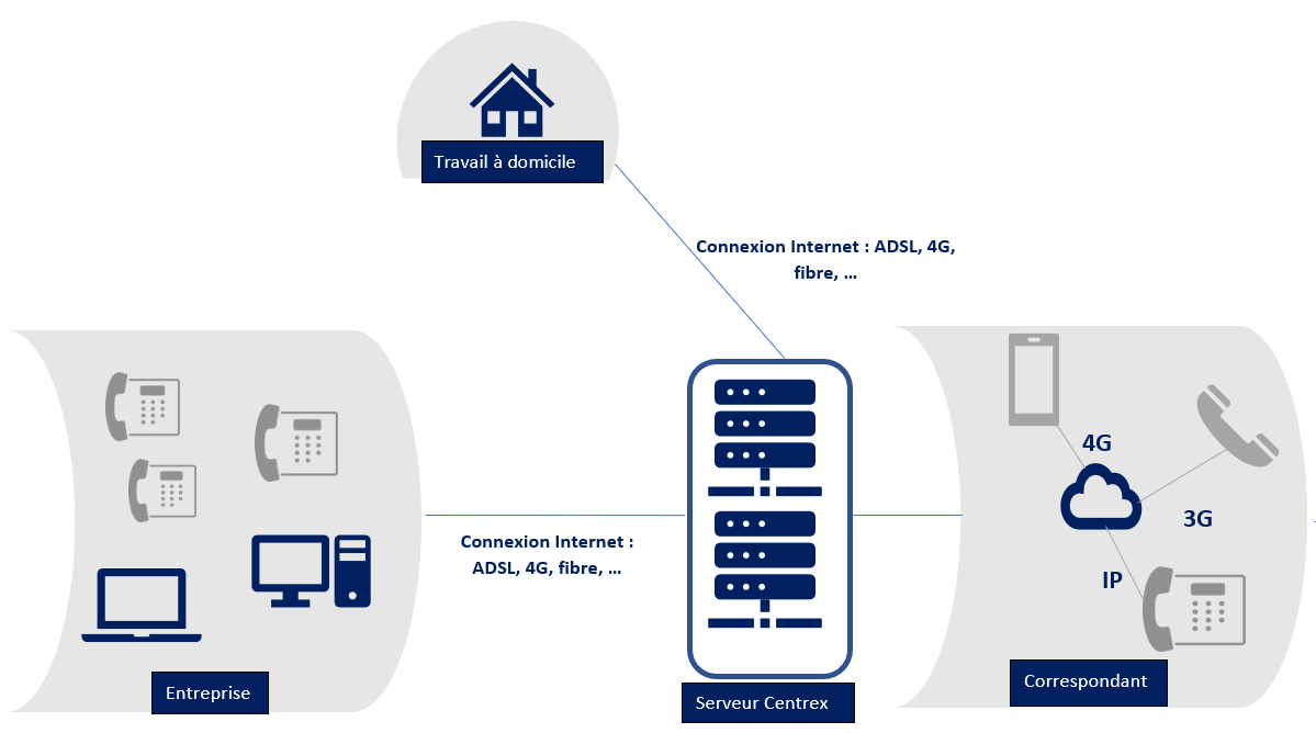 Les téléphones des utilisateurs s'authentifient au Centrex via Internet tandis que les appels entrants et sortants transitent en IP.